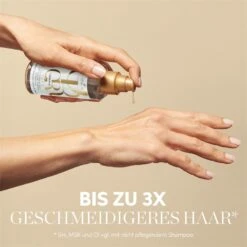 Avant d’utiliser le produit riche, agiter vigoureusement le flacon pour que les ingrĂ©dients se mĂ©langent bien. Ensuite, versez une Ă deux portions dans vos paumes et travaillez l’huile uniformĂ©ment sur les pointes et les longueurs. Ce produit est un produit sans rinçage qui n’a pas besoin d’être rincĂ©, mais reste dans les cheveux. Grâce Ă une petite quantitĂ© d’huile dans les cheveux secs, vous pouvez donner un Ă©clat supplĂ©mentaire Ă vos cheveux. Vos cheveux ont l’air pleins de vie et jeunes, frais et sains, car ils ont reçu des soins prĂ©cieux.